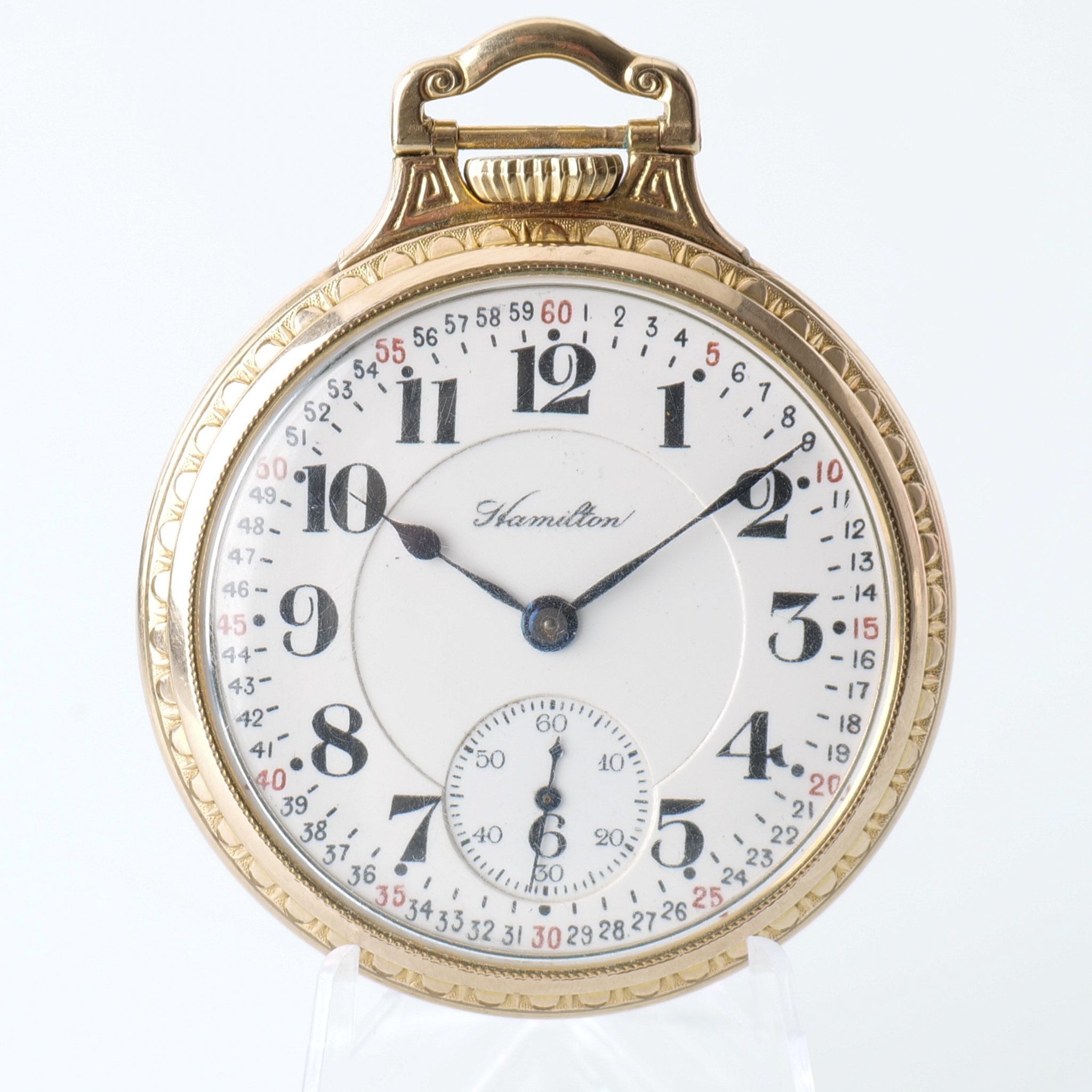 Incredible condition. No tension on mainspring when wound, so it needs a new one. The dial and case are awesome. The gold filled case doesn't show any issues and is very nice. Very nice bow, bar and signed Hamilton crown. The balance swings freely. Dial is flawless and doesn't have any hairlines visible. This pocket watch comes from a long time collectors estate.